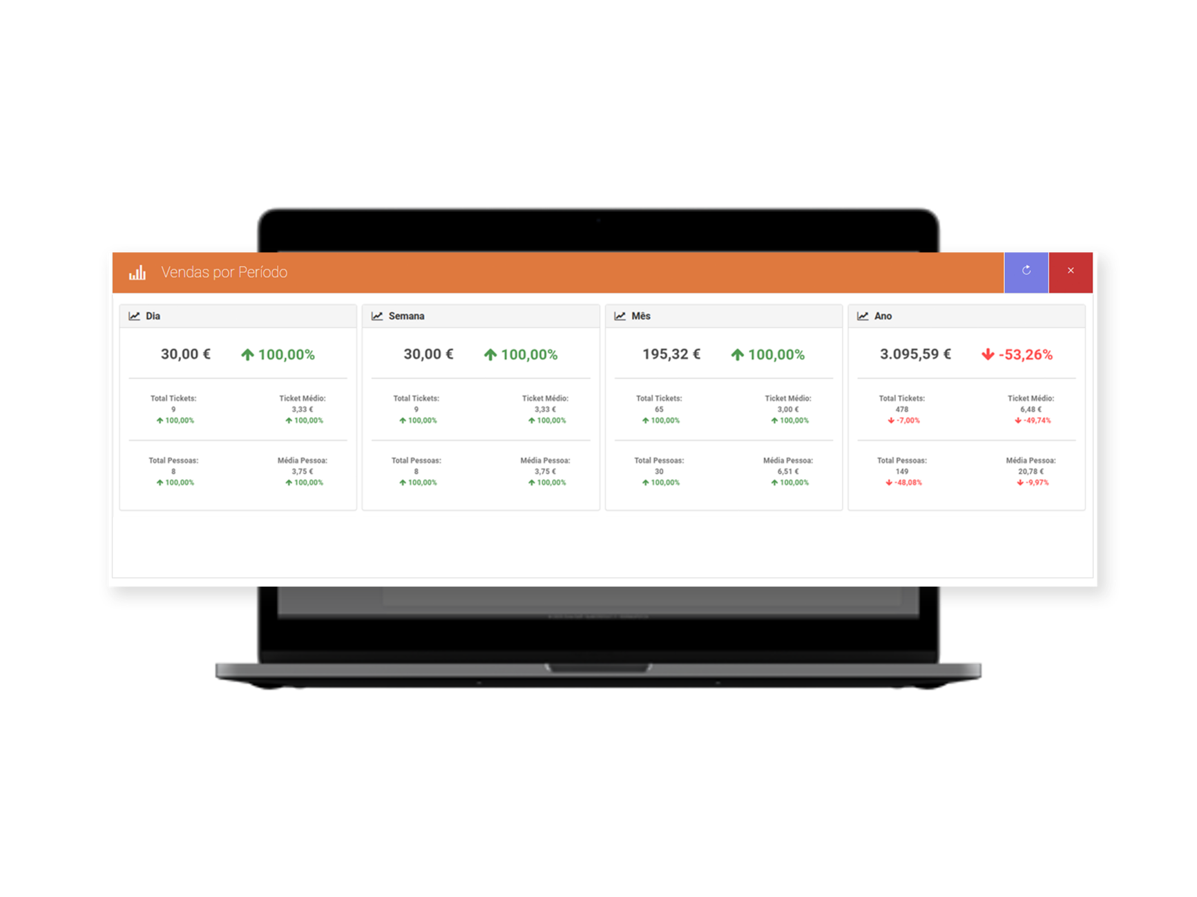 Cada período mostra automaticamente o total, o ticket médio, o número de pessoas e a comparação com períodos anteriores.